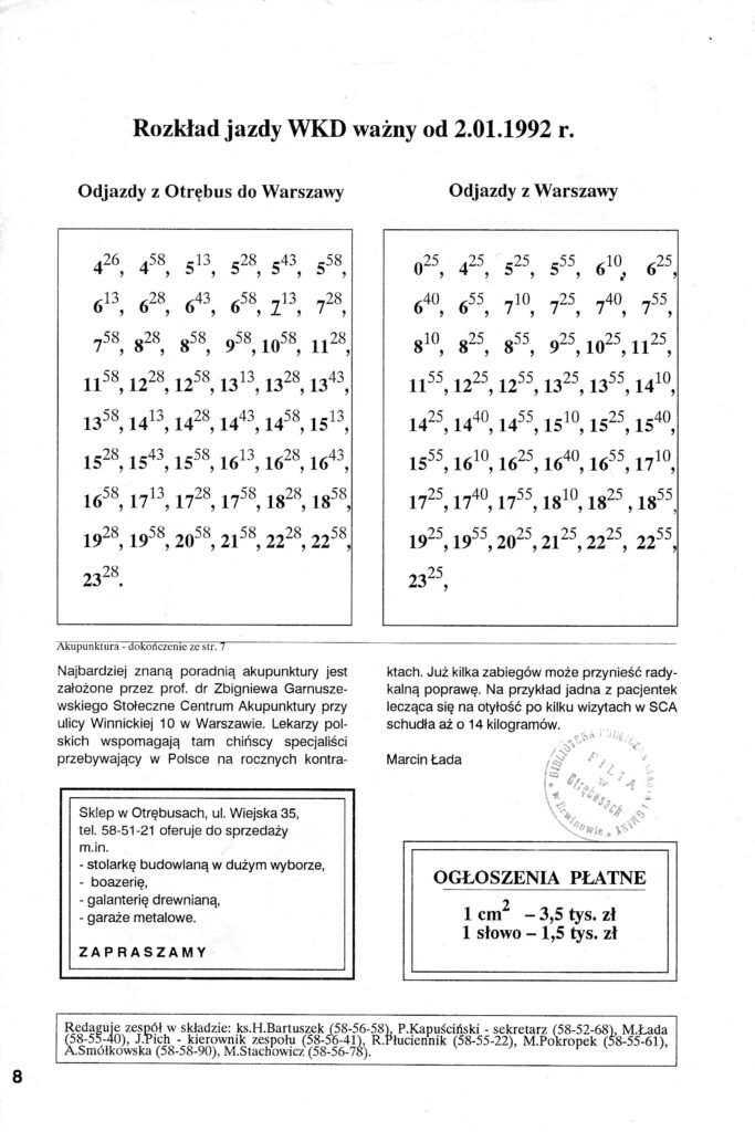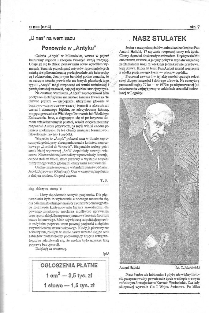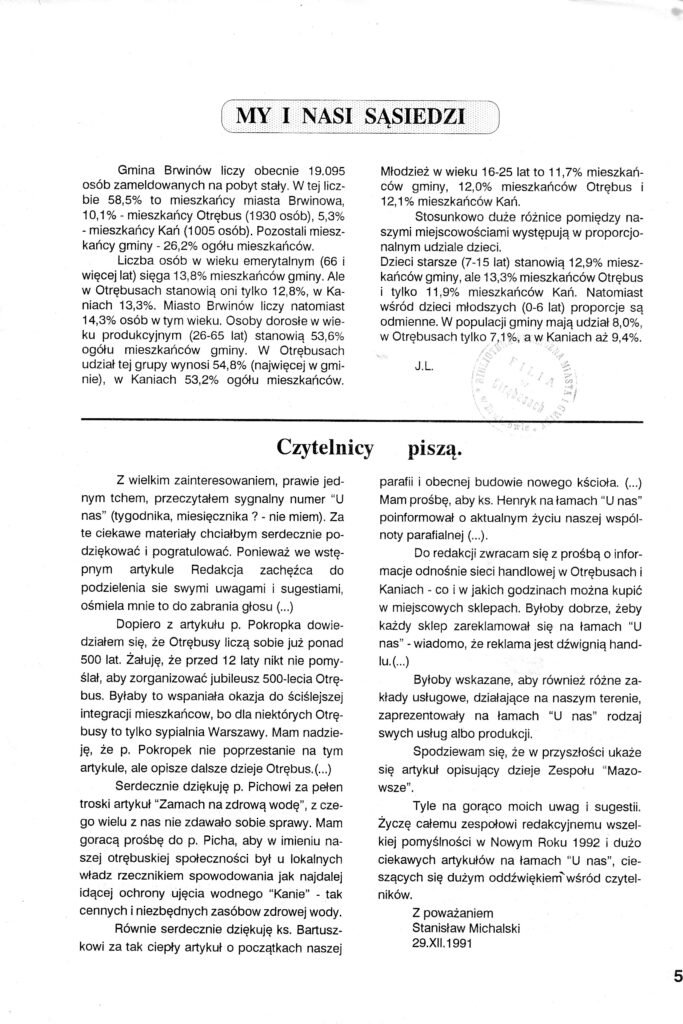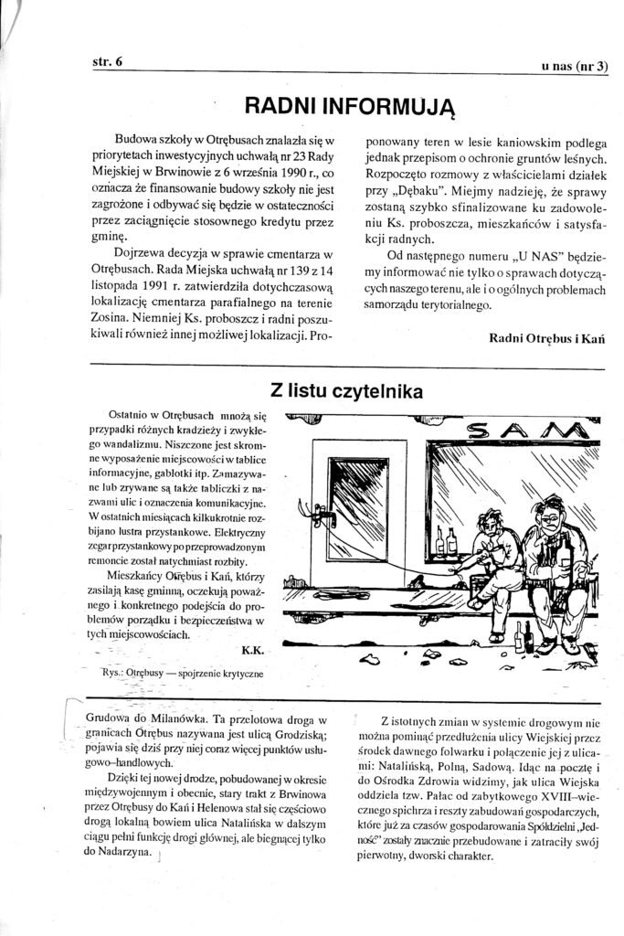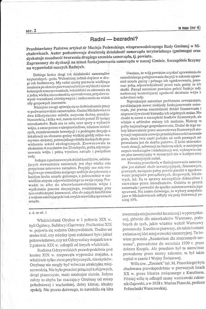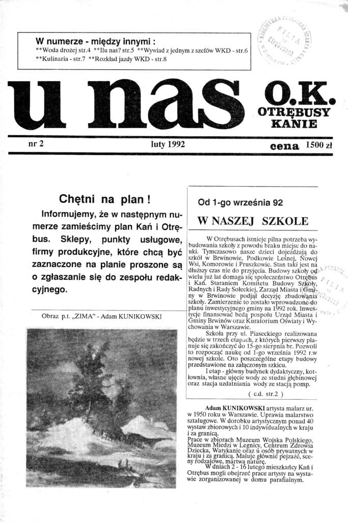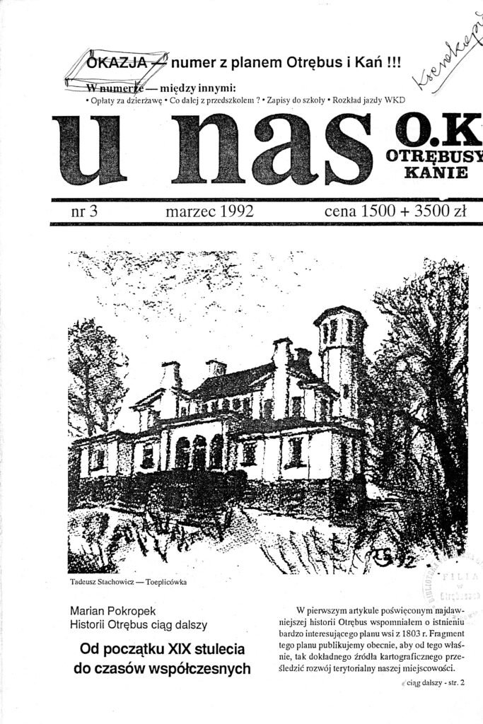 Czasopismo regionalno-lokalne o tytule „U Nas O.K.” : miesięcznik powiatu pruszkowskiego założone i redagowane przez Tadeusza Stachowicza (1938-2014) Stachowicz, Tadeusz (1938-2014). Wcześniejszy tytuł : U Nas (Otrębusy). Wcześniejszy tytuł : U Nas O.K. : Otrębusy, Kanie.